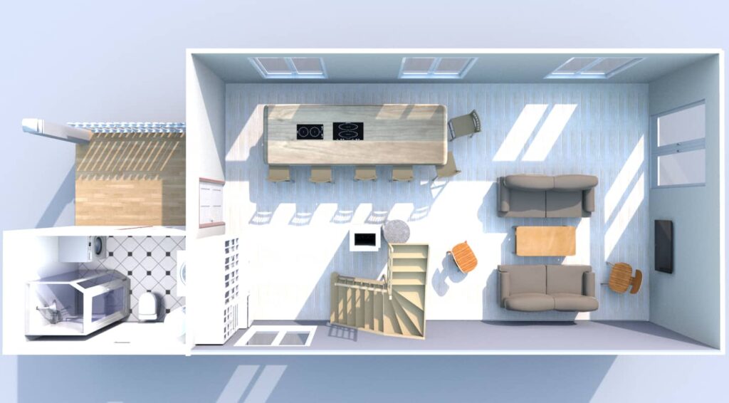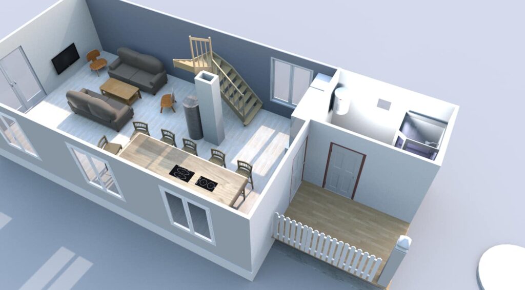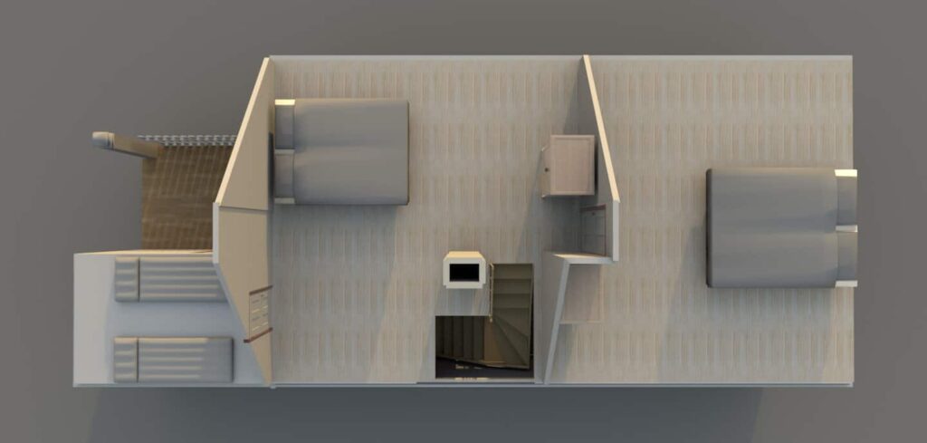 The house will have 2 bedrooms upstairs with double beds (4 adults) + 1 children’s den with 2 single mattresses, so house sleeps total of 6 people.